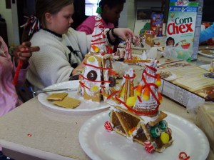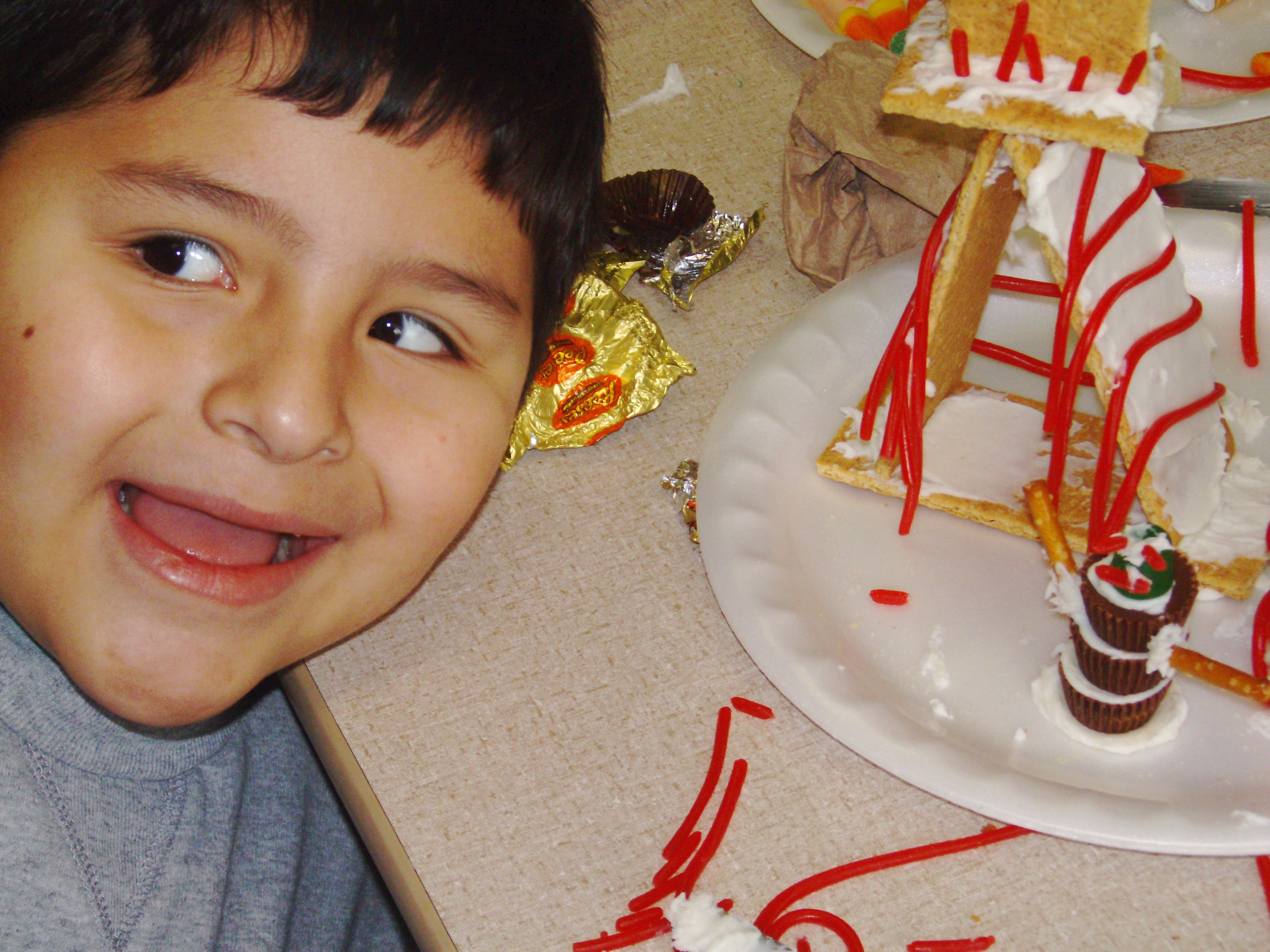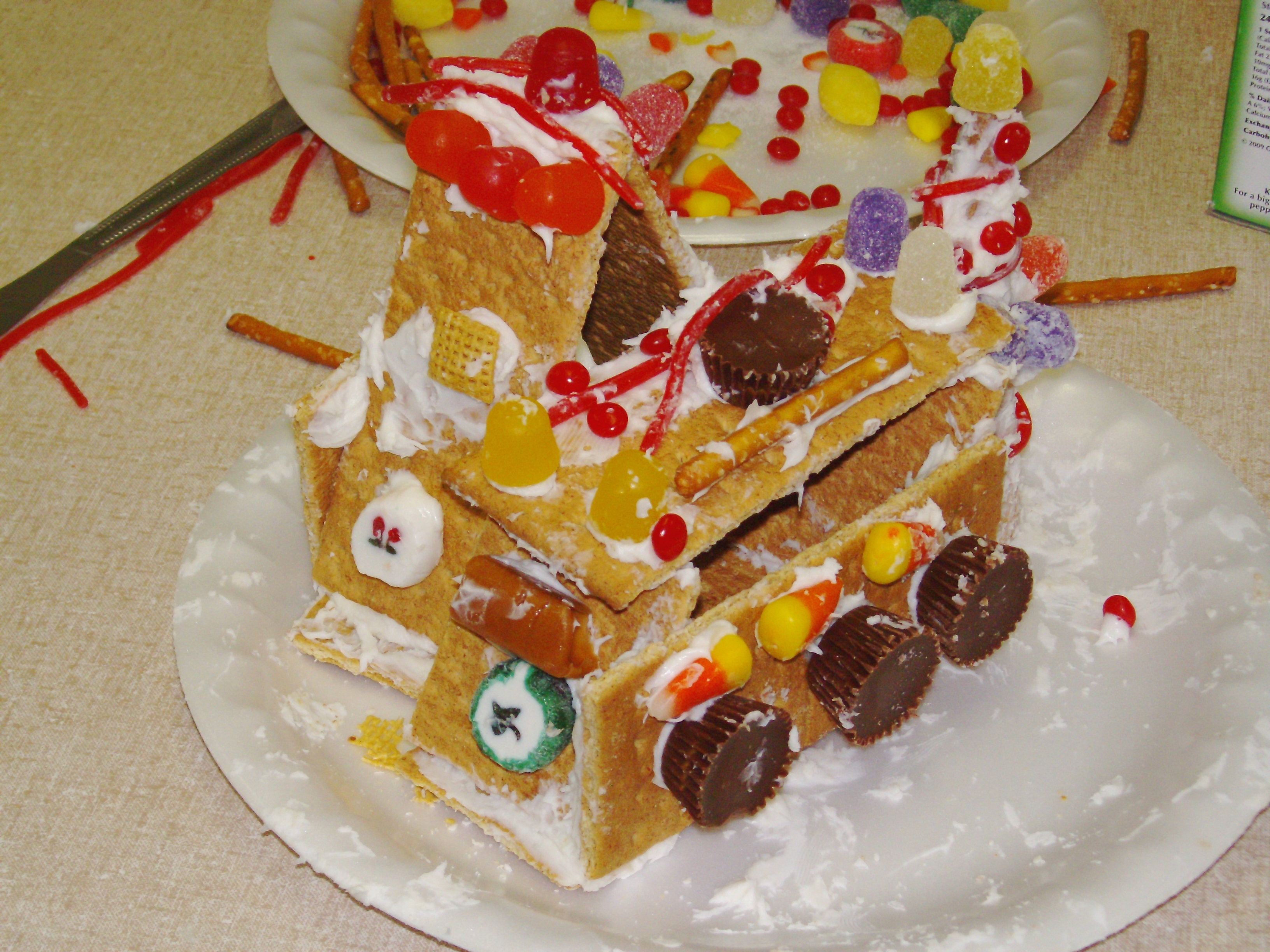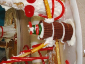 We made these with our homeschool group, the foundation was graham crackers. The brand name ones really did hold up better! We used white “whipped” frosting from a round container. I bought red long licorice, sugar cones, little round pb cups, gum drops and more.