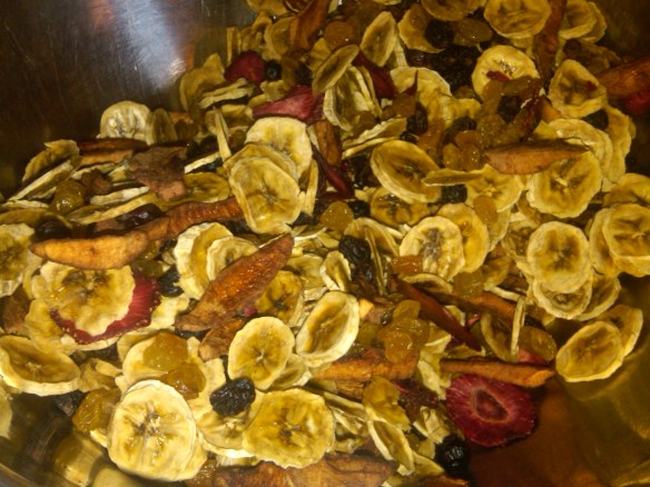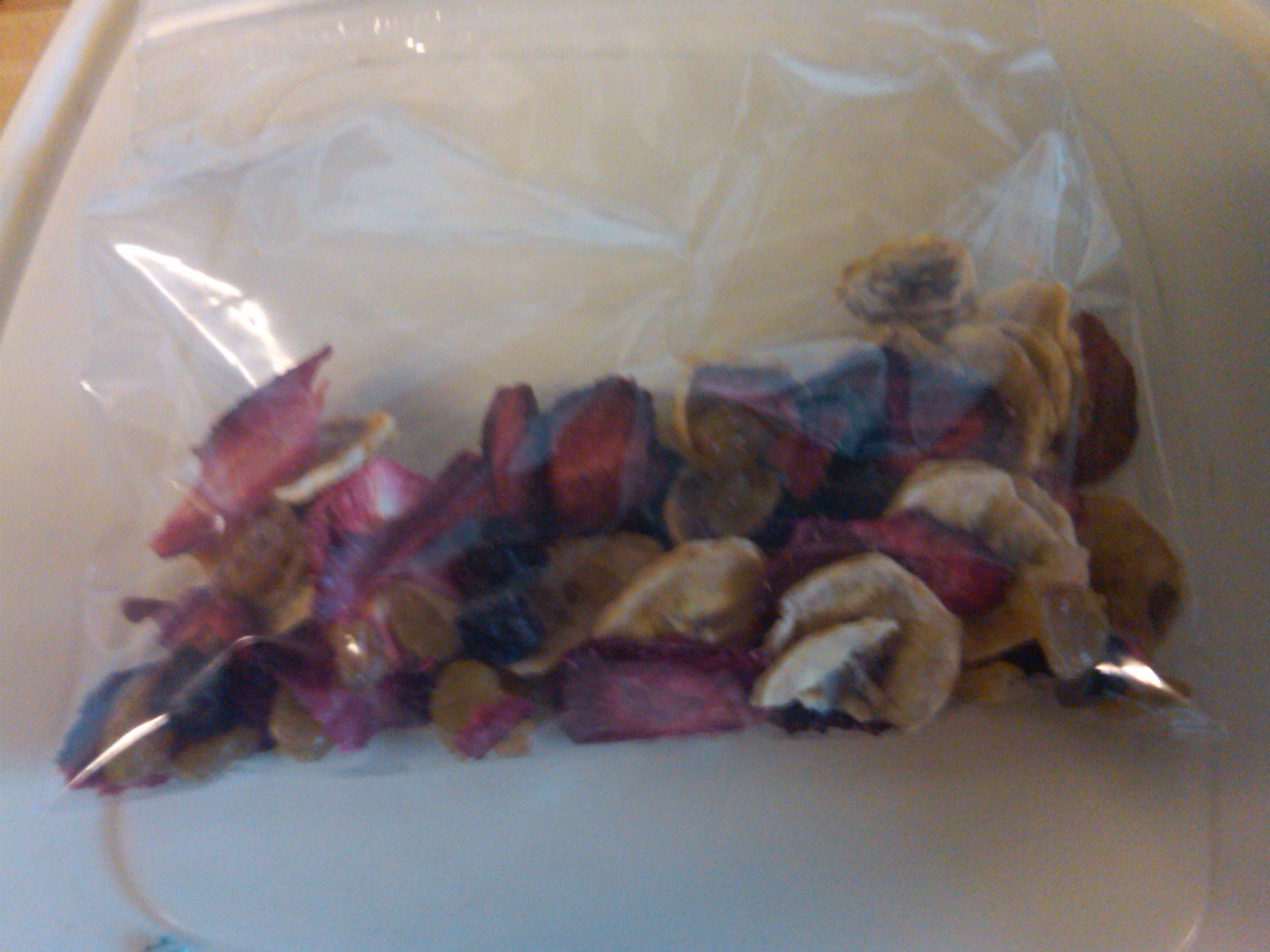 This is banana chips, strawberry pcs., apple chunks (those got a little too brown, but tasted great!) and then I added raisins and dried organic cranberries.